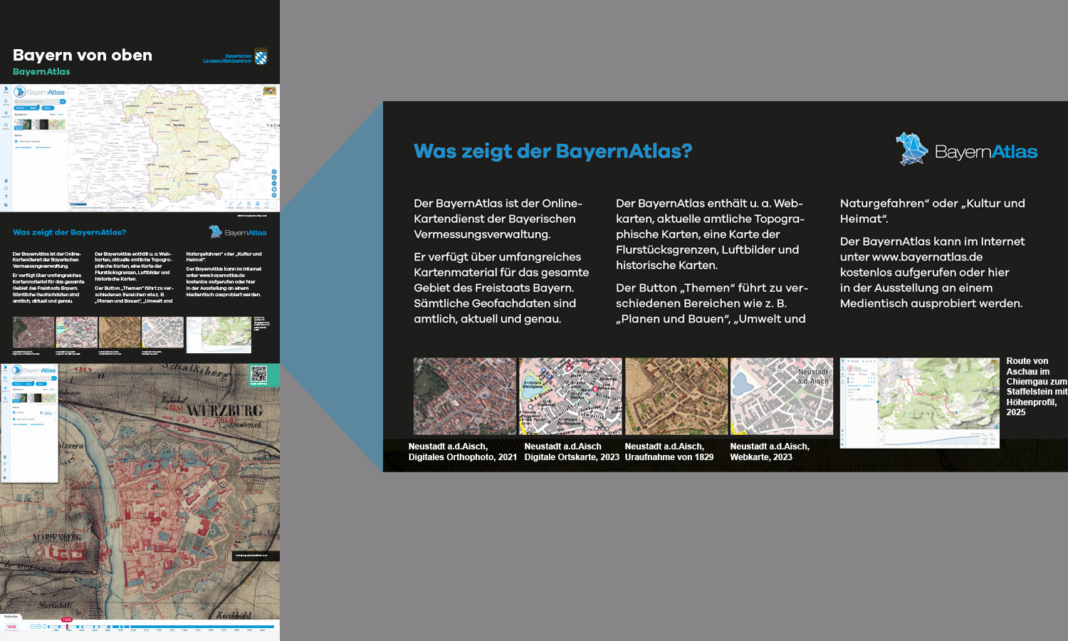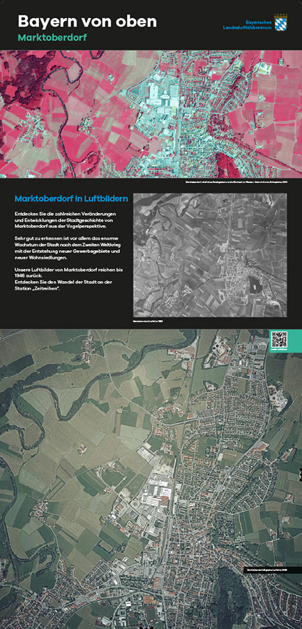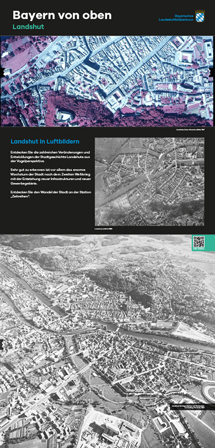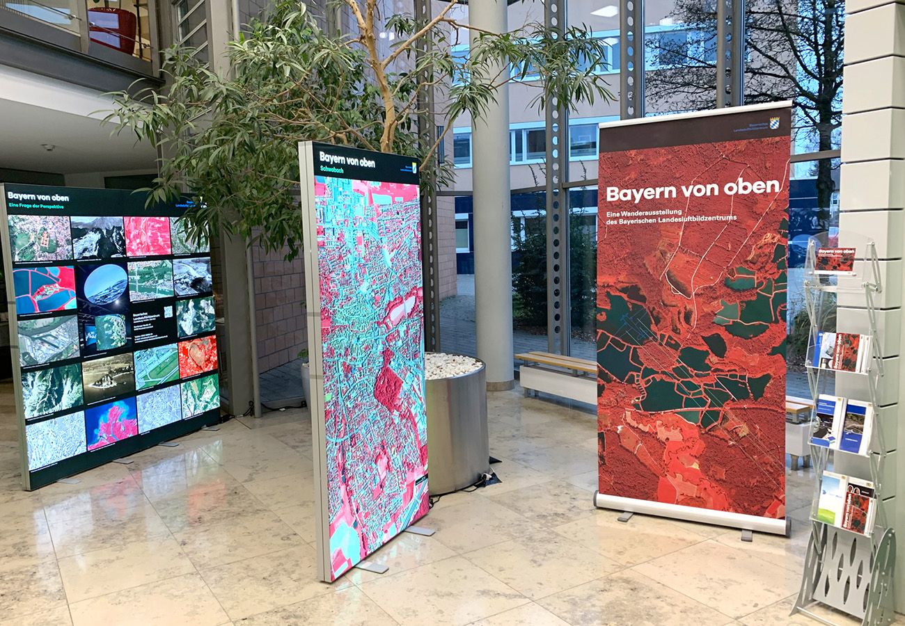 Anlässlich des fünfjährigen Bestehens des Bayerischen Landesluftbildzentrums stellte die Wanderausstellung dessen Angebote einem breiten Publikum vor. Die multimedial gestaltete und leicht verständlich aufbereitete Ausstellung vermittelt einen spannenden Einblick in die Geschichte und Technik der Luftbildfotografie. Auf 14 Ausstellungstafeln wurde den Besucherinnen und Besuchern gezeigt, wie Luftbilder gemacht werden, wie sie aufbereitet werden und wo sie eingesetzt werden.